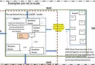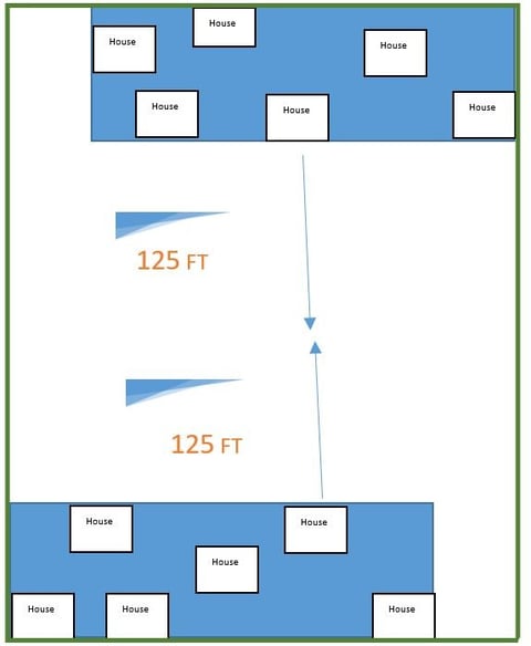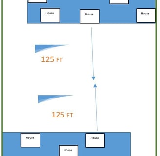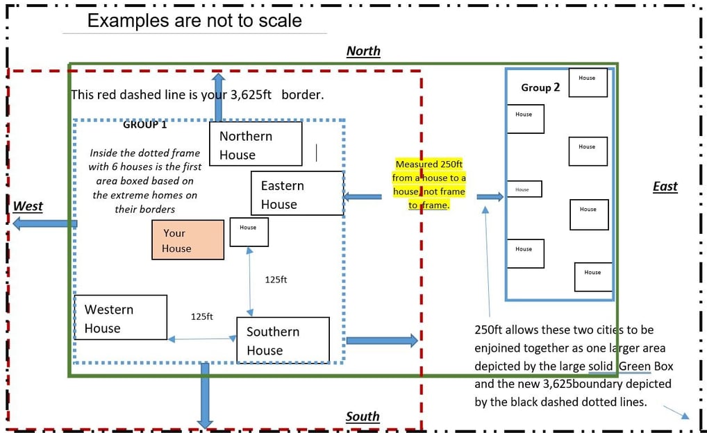 5. OR If you have two groups of 6 houses with a space of up to 250ft between them, are afforded a double distance - 125ft from each group of 6 houses, or 250ft together. See Green Solid Frame